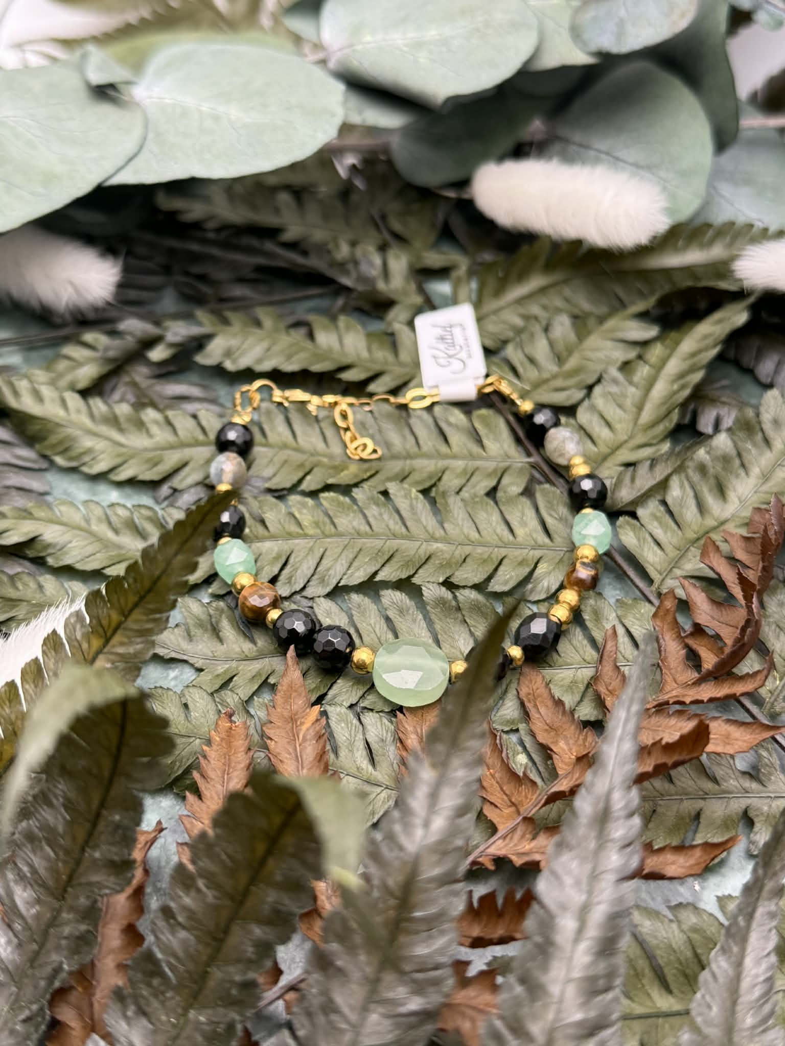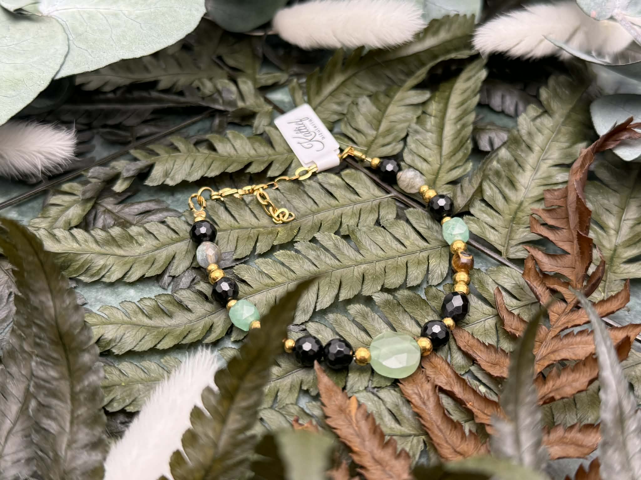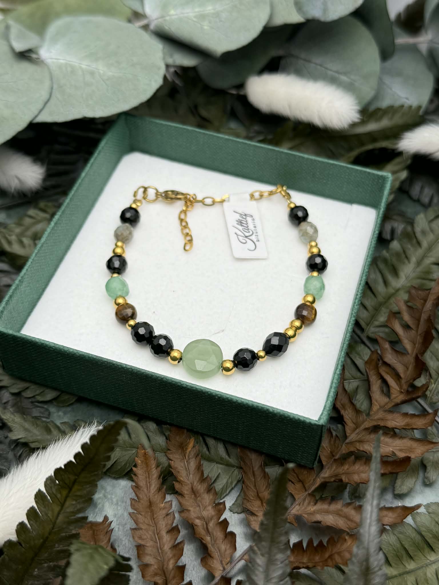 Bransoletka zapinana na solidny karabińczyk została wykonana z naturalnych kamieni oraz wykończona elementami ze złotej stali chirurgicznej, co zapewnia trwałość i komfort noszenia. Połączenie głębokiej czerni, zieleni, ciepłych brązów i subtelnych refleksów labradorytu tworzy harmonijną, a zarazem wyrazistą kompozycję o silnym działaniu energetycznym.