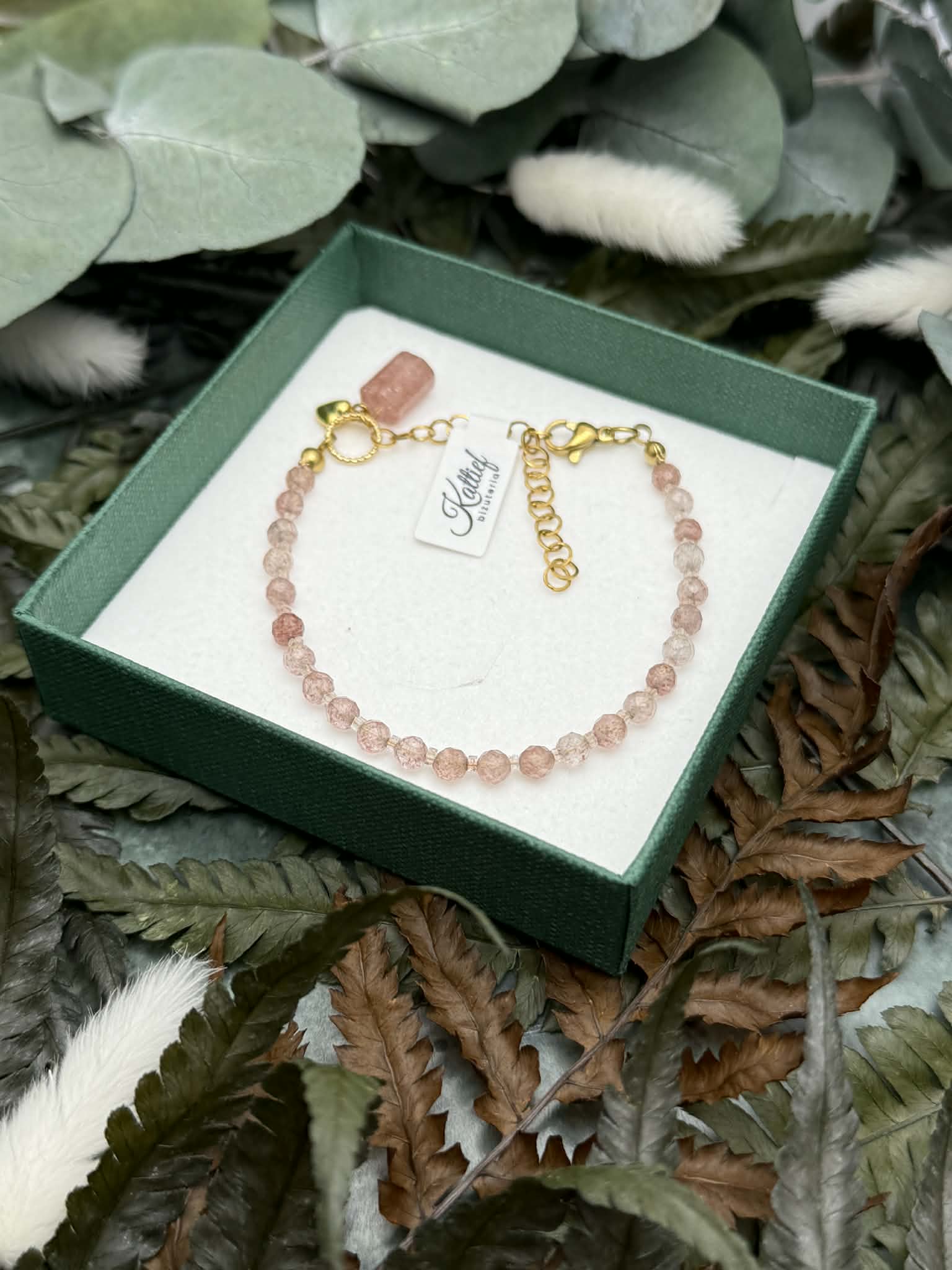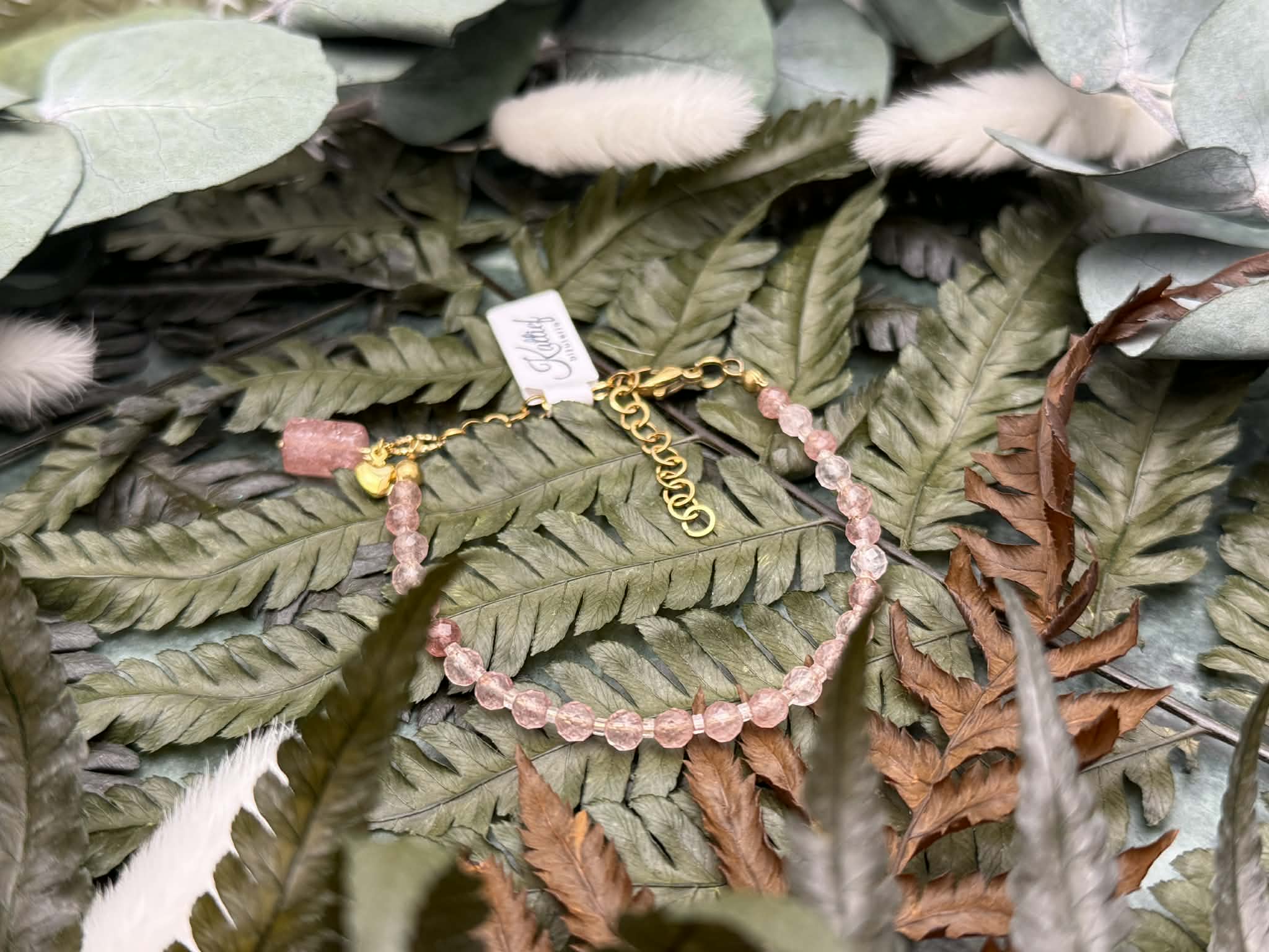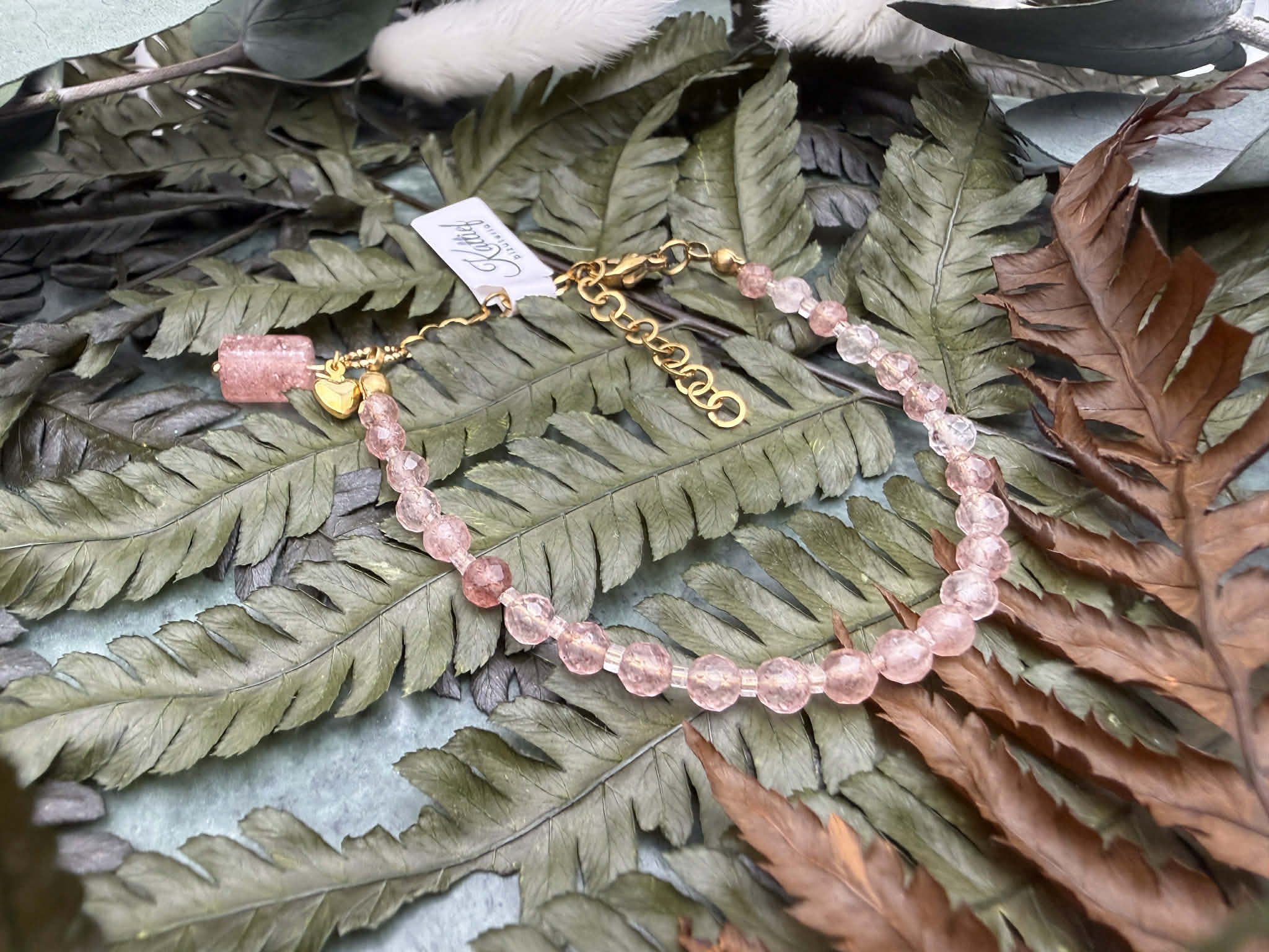 Bransoletka zapinana na klasyczny karabińczyk została wykonana z naturalnego kwarcu truskawkowego oraz wykończona elementami ze złotej stali chirurgicznej i gold filled, co zapewnia trwałość, komfort noszenia i elegancki wygląd. Ciepłe, różowo-brzoskwiniowe odcienie kamieni pięknie komponują się ze złotymi akcentami, tworząc subtelną, kobiecą i pełną blasku kompozycję. Kamienie zostały starannie fasetowane, dzięki czemu efektownie odbijają światło, nadając biżuterii delikatny, szlachetny połysk przy każdym ruchu dłoni. Ozdobnym elementem jest gładki wałek z kwarcu, który dodaje harmonii i wyjątkowego charakteru, a całość dopełnia urocza mini zawieszka w kształcie serca ze złotej stali – symbol miłości, czułości i pozytywnej energii.