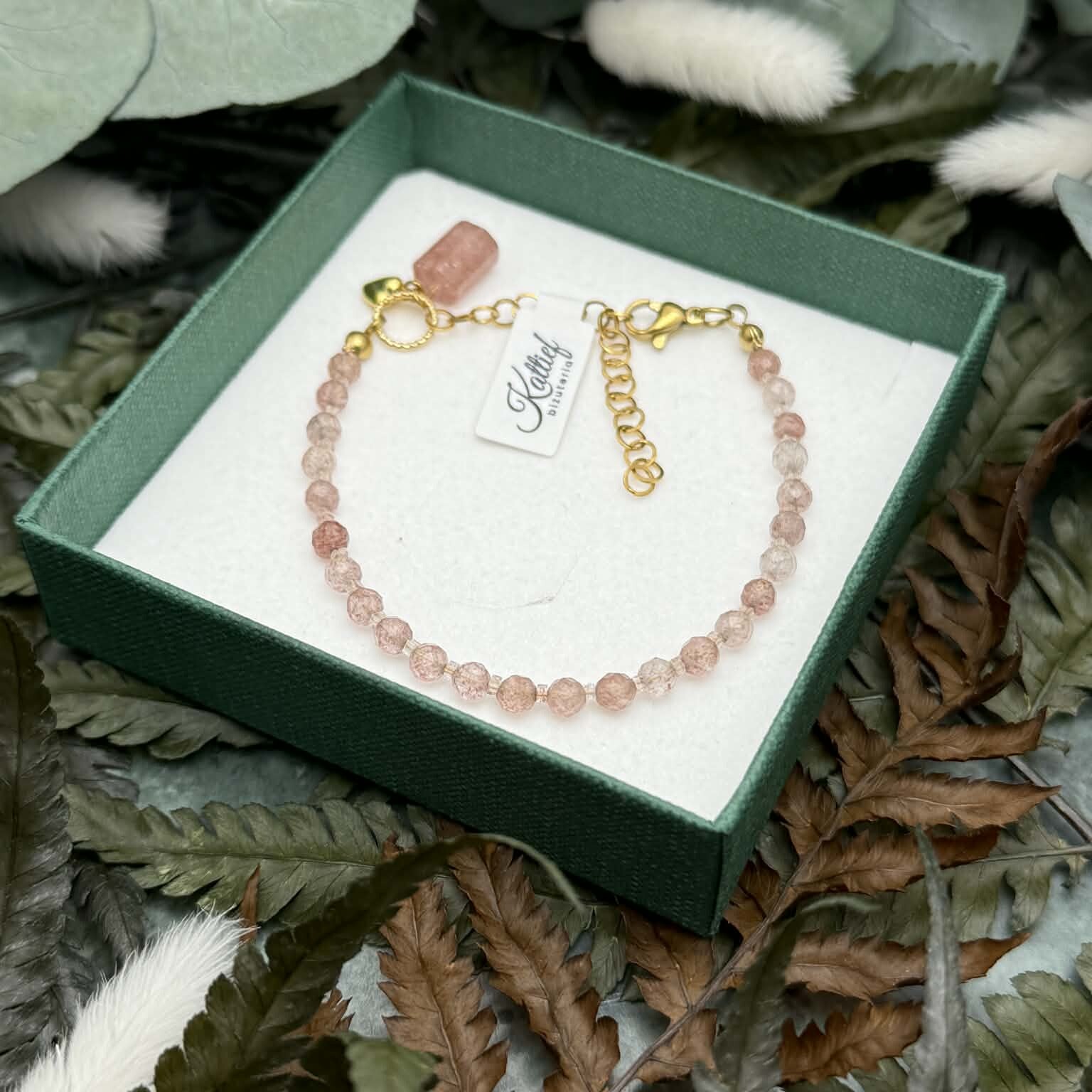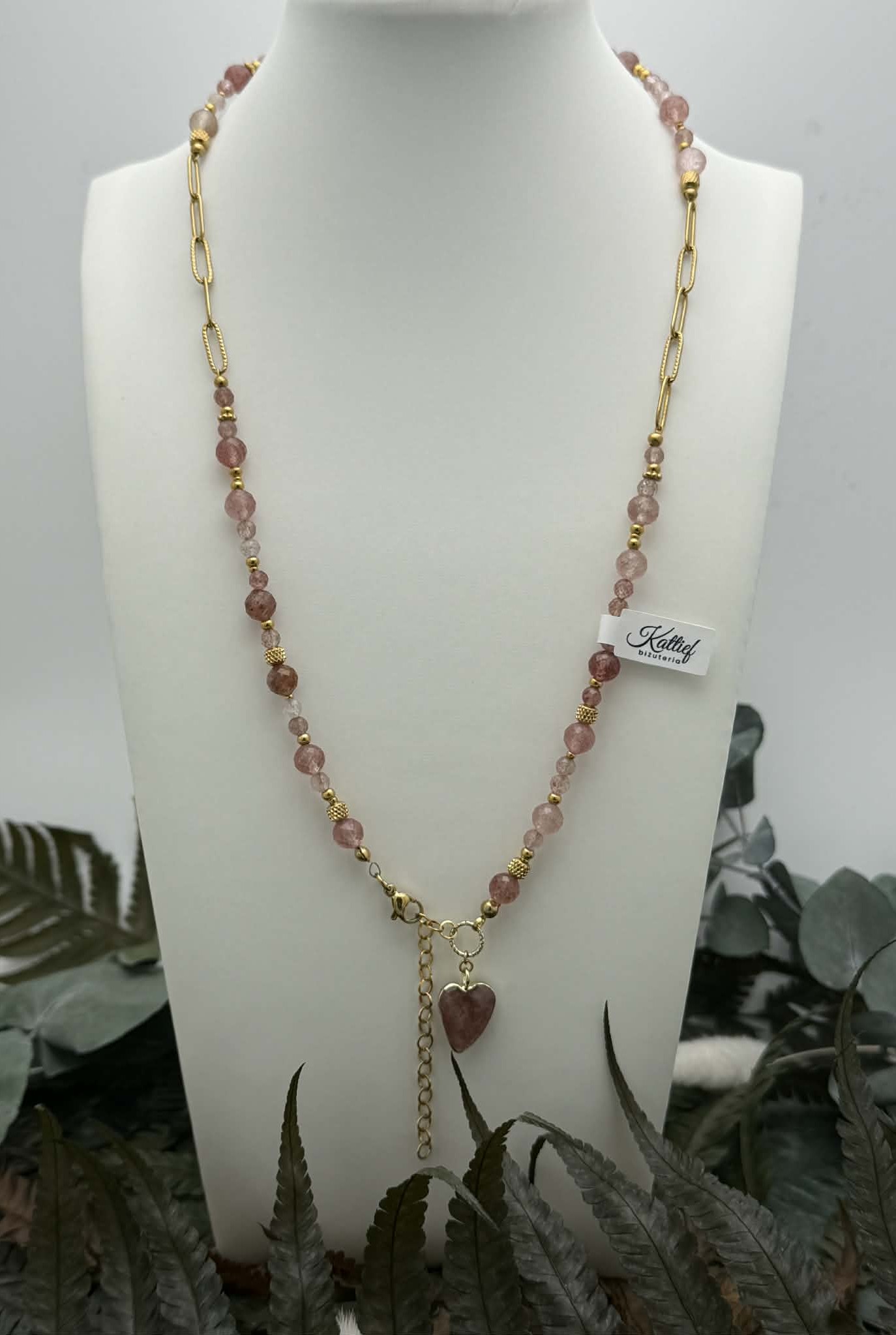 Ten wyjątkowy naszyjnik został wykonany z naturalnego kwarcu truskawkowego, którego ciepłe, różowe odcienie z delikatnymi inkluzjami zachwycają subtelnym blaskiem i romantycznym charakterem. Kamień ten uznawany jest za symbol miłości, radości oraz pozytywnej energii — wspiera harmonię emocjonalną, wzmacnia poczucie własnej wartości i przyciąga dobre relacje.
