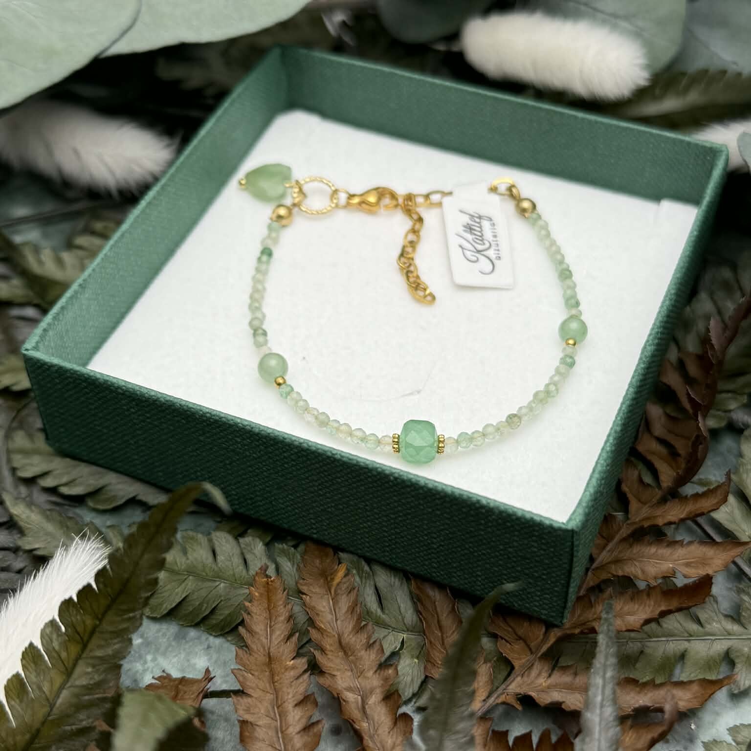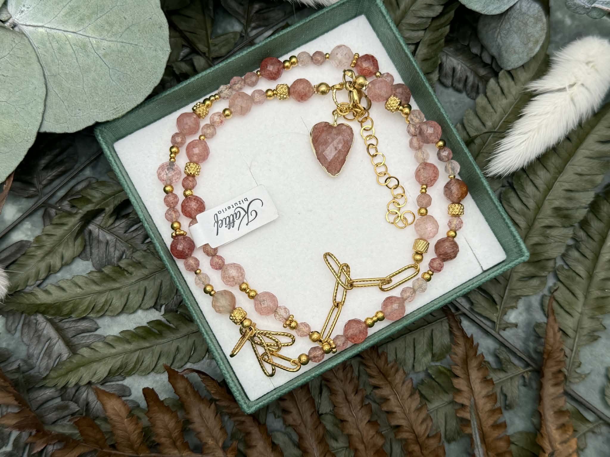 Centralnym elementem kompozycji jest zawieszka w kształcie serca, również wykonana z kwarcu truskawkowego, umieszczona w eleganckim okuciu ze stopu metali bezniklowych, bezpiecznym dla skóry i komfortowym w noszeniu. Całość dopełniają ozdobne akcenty ze stali chirurgicznej w złotym kolorze, które nadają biżuterii elegancji, trwałości i nowoczesnego charakteru.