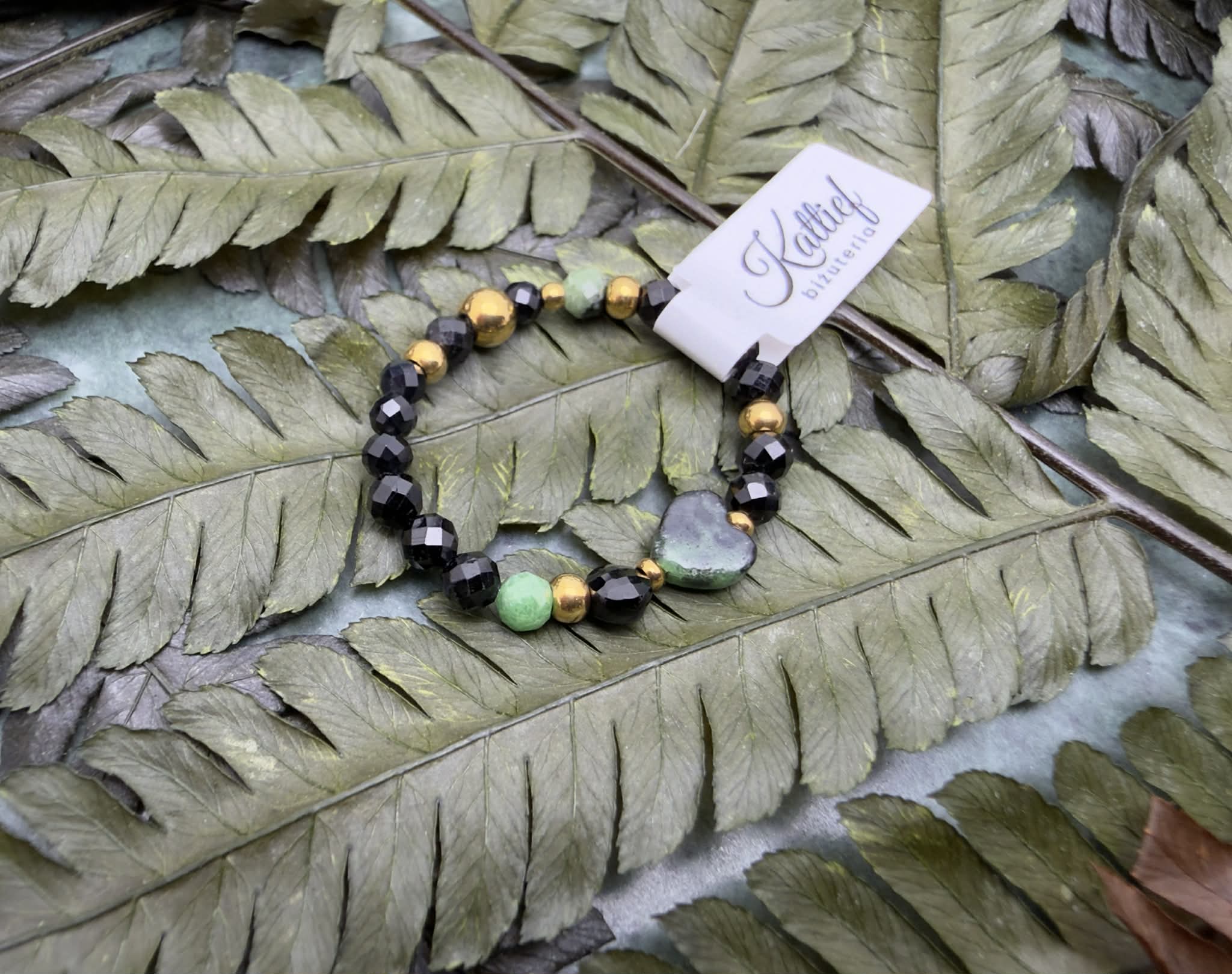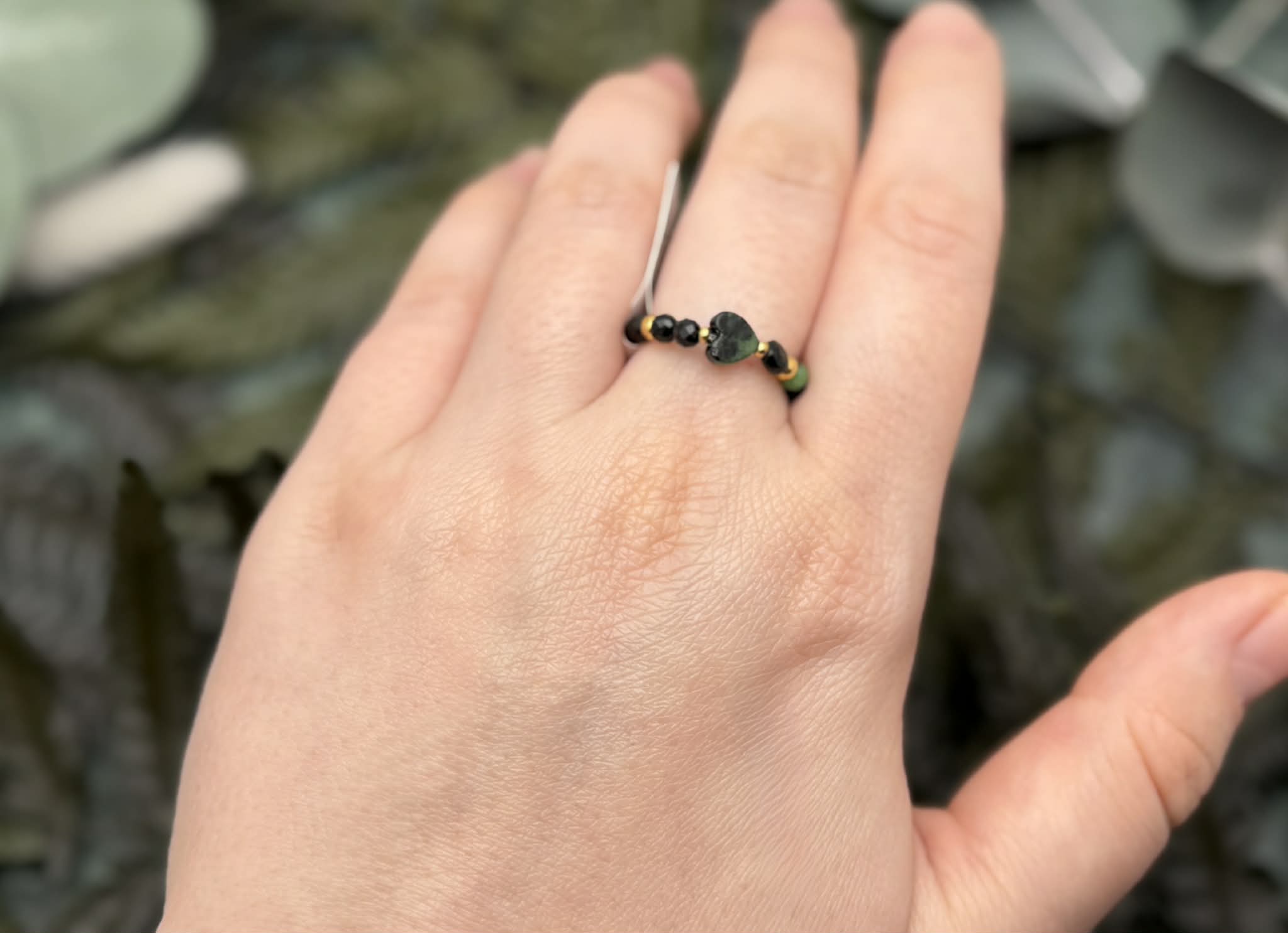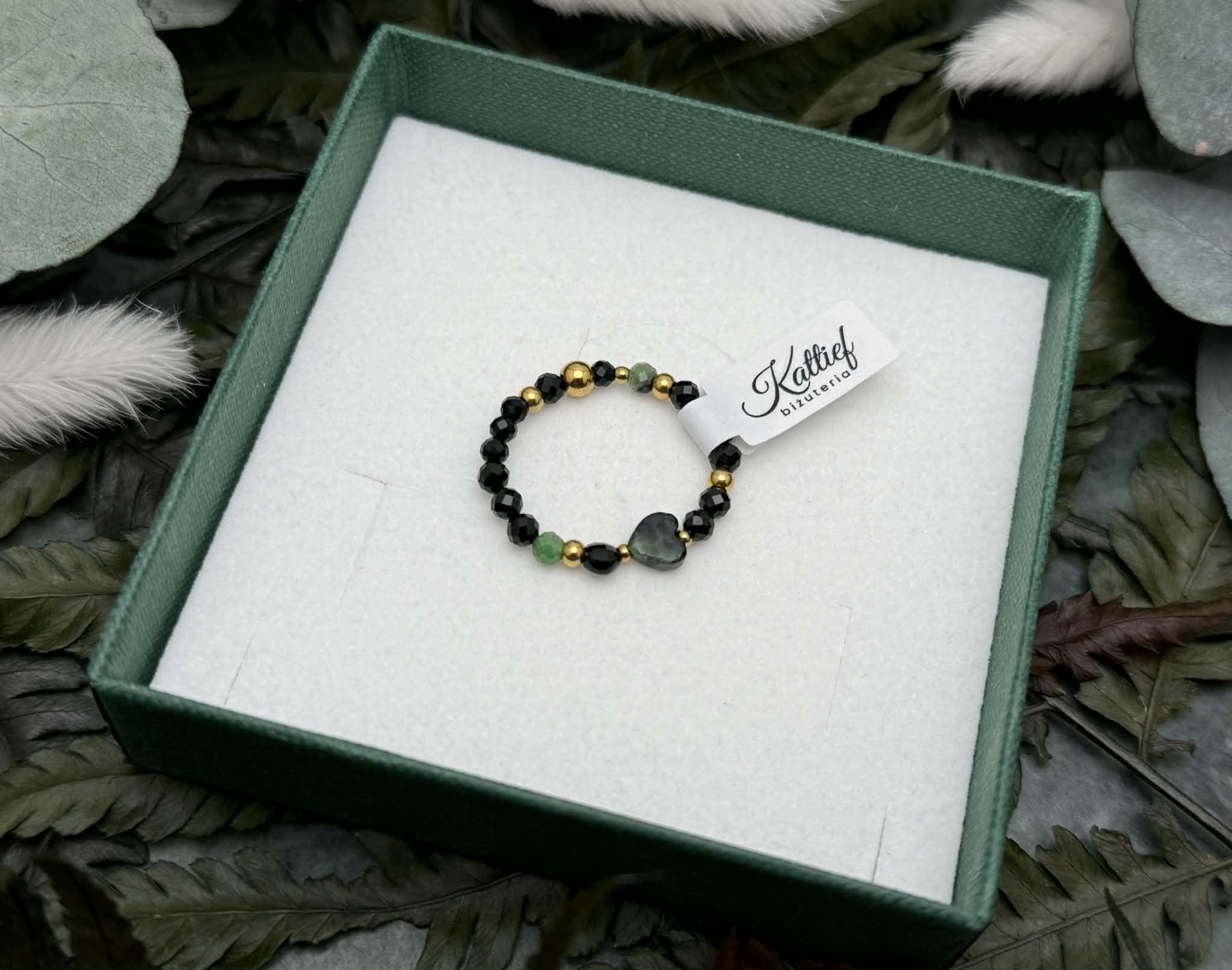 Pierścionek na elastycznej gumce wykonany z naturalnego czarnego turmalinu, zoisytu z rubinem oraz ozdobnych elementów ze złotej stali chirurgicznej. Połączenie głębokiej czerni turmalinu z energetycznymi zielono-różowymi odcieniami zoisytu z rubinem tworzy wyjątkową, harmonijną kompozycję. Kamienie pięknie odbijają światło, nadając biżuterii elegancki i wyrazisty charakter.