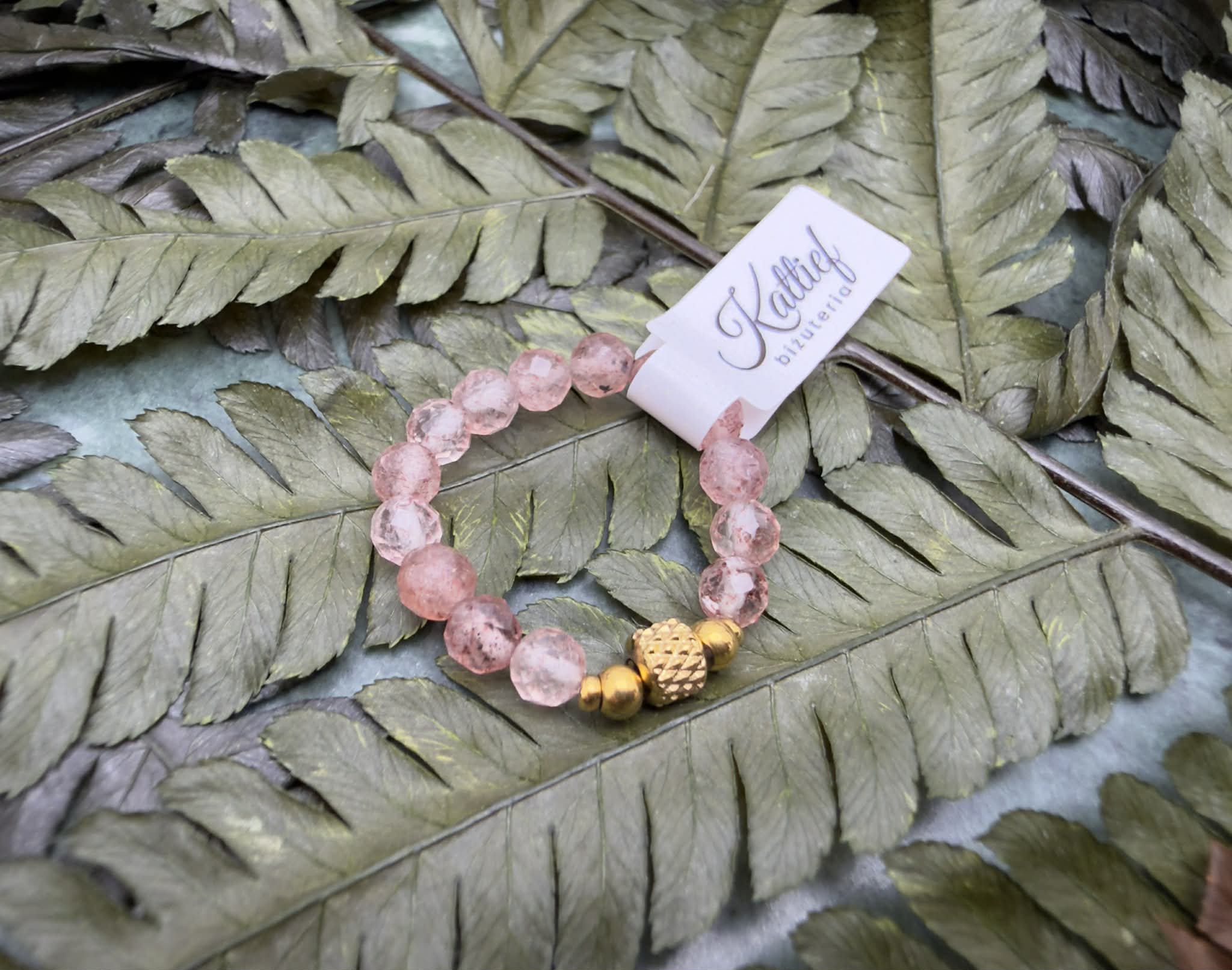 Pierścionek na elastycznej gumce wykonany z naturalnego kwarcu truskawkowego, z ozdobnymi elementami ze złotej stali chirurgicznej, uzupełniony różową cyrkonią. Biżuteria z kamieni naturalnych o delikatnym różowym odcieniu z subtelnymi inkluzjami, która doskonale uzupełni zarówno codzienne stylizacje, jak i eleganckie zestawy.
