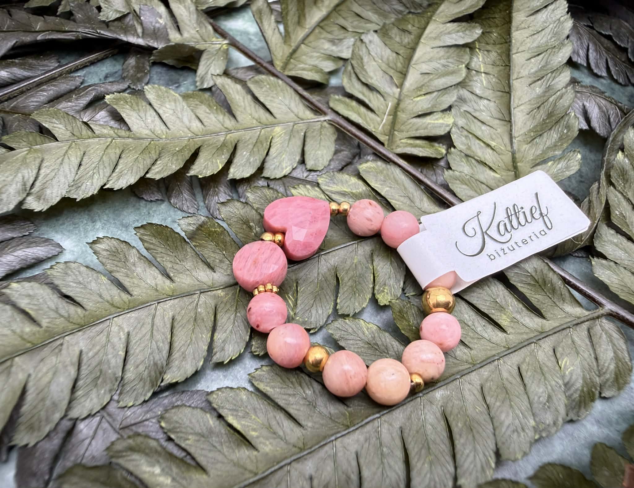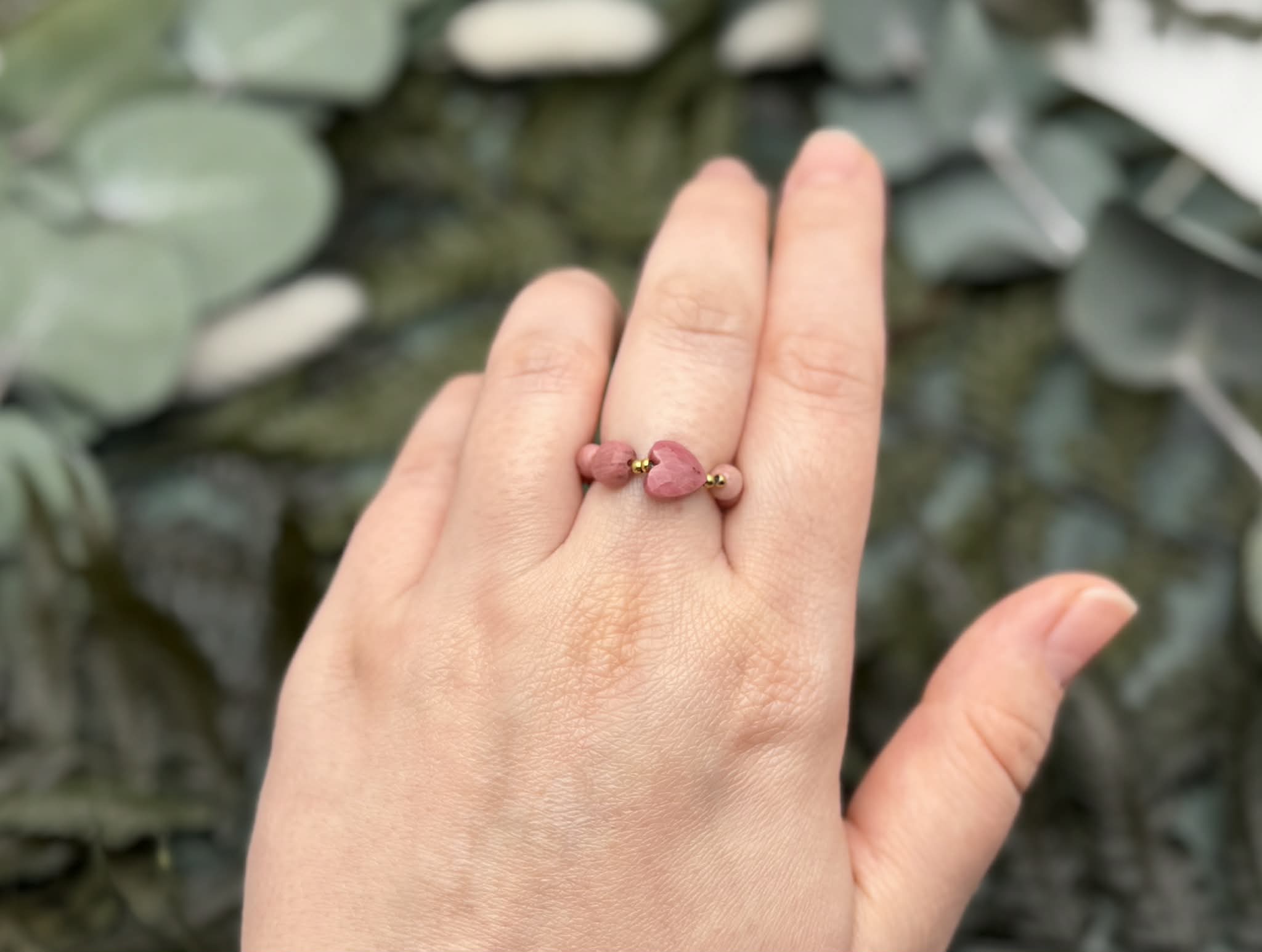 Pierścionek na elastycznej gumce wykonany z naturalnego rodonitu oraz ozdobnych elementów ze złotej stali chirurgicznej.